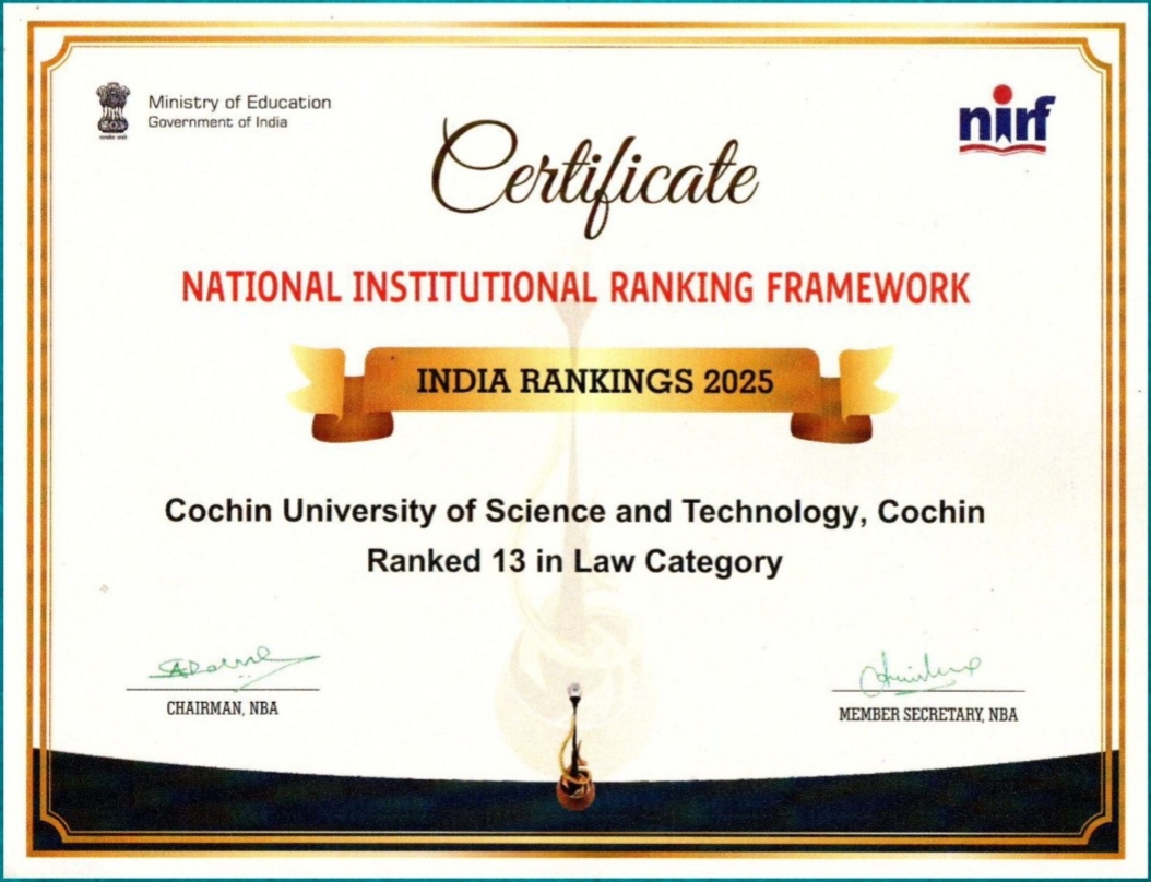 CUSAT has also achieved commendable discipline-specific rankings in NIRF 2025. The faculty of Law continues to uphold its legacy of excellence, securing the 13 th rank in the Law Category, placing it among the top law schools in the country. Likewise, in the Management Category, the University has been ranked 82 nd , indicating its strong potential and evolving performance in management education and research.